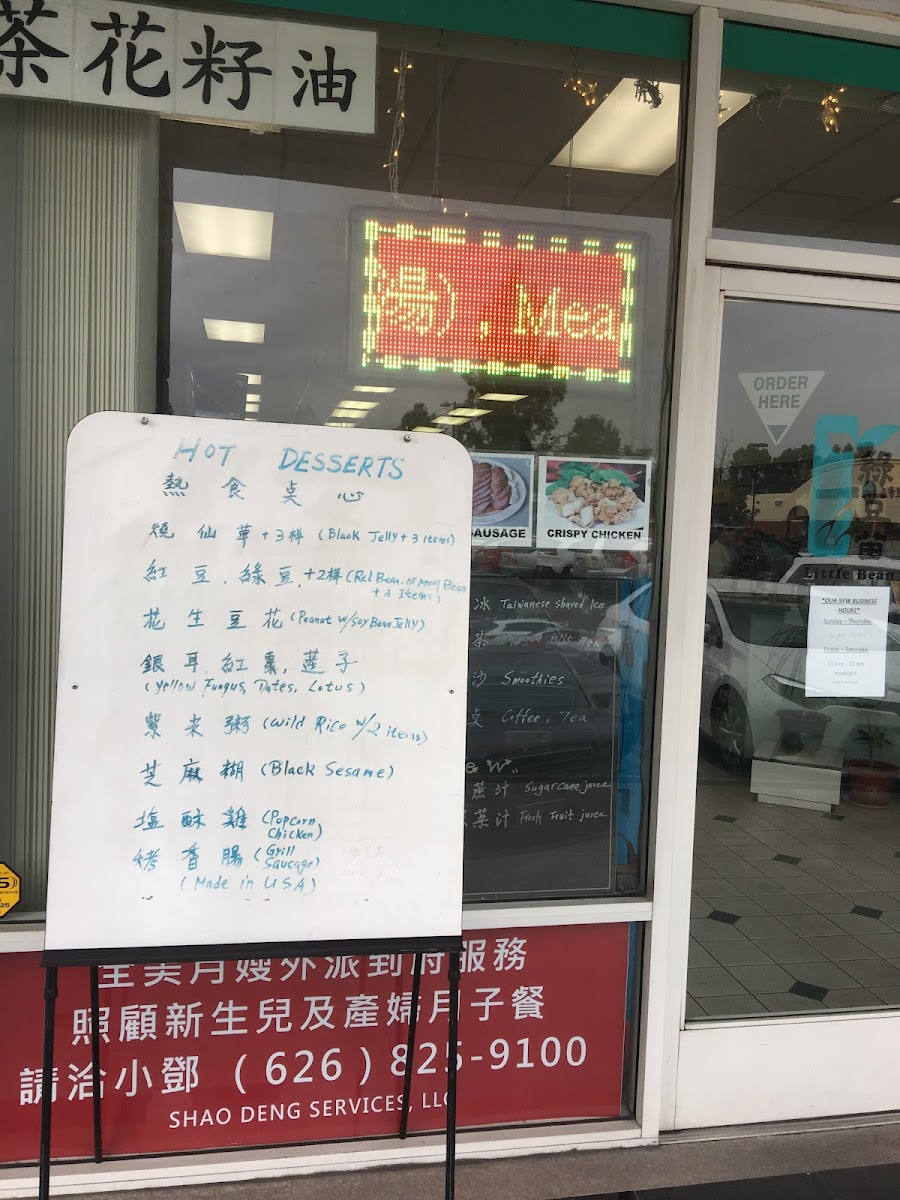 From a reviewer’s perspective, the menu at Little Bean offers a wide variety of refreshing drinks and traditional desserts, with highlights across several categories. The flavored drinks such as Red Sour Plum Juice, Black Sour Plum Juice, Kiwi Honeydew, and Guava Juice provide light and fruity options, while the milk shake selection including Banana, Strawberry, Avocado Taro, and Mung Bean leans toward creamy and filling choices. The smoothies section is especially diverse, featuring favorites like Thai Tea With Boba, Avocado With Milk, Taro With Milk, Mocha Fudge Delight, and Pina Colada, along with milk-based smoothies like Red Bean, Banana Peanut, and Mung Bean. For warm treats, the hot desserts such as Green Bean, Red Bean, Black Sesame With Two Items, Peanut Plus Soy Bean Jelly, and Yellow Fungus, Dates, Lotus Seeds offer comforting traditional flavors. The House Special Tapioca options, including Tapioca With Green Bean & Tea, Tapioca Milky Red Tea, and Tapioca With Custard & Tea, are also standout items for tapioca lovers. The Taiwan Shaved Ice menu with Taro, Mango Shaved Ice, Green Bean, and Tapioca adds a refreshing dessert option, while drink choices expand further with Roselle (Jamaica), Peach Red/Green Tea, Lychee Green Tea, and Italian coffees like Espresso, Affogato, Cappuccino, Cafe Latte, and Mocha Coffee. Overall, the menu focuses on Taiwanese-style desserts and beverages, offering a broad selection that caters to both fruity and creamy flavor preferences.